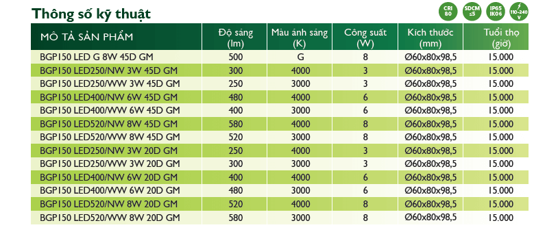 BGP150 LED250/WW 3W 20D GM |